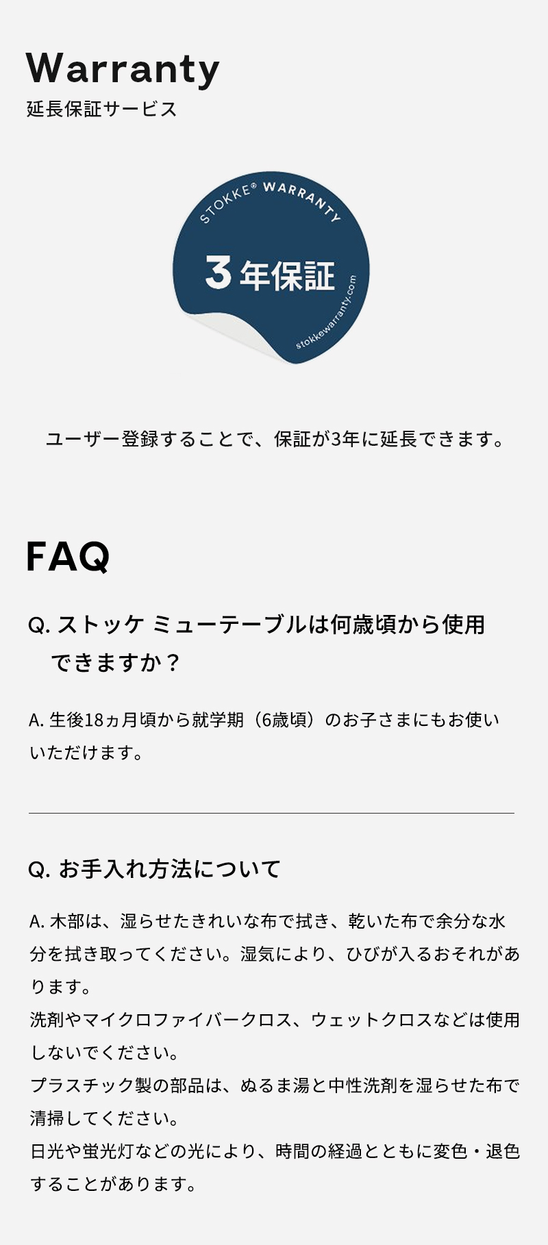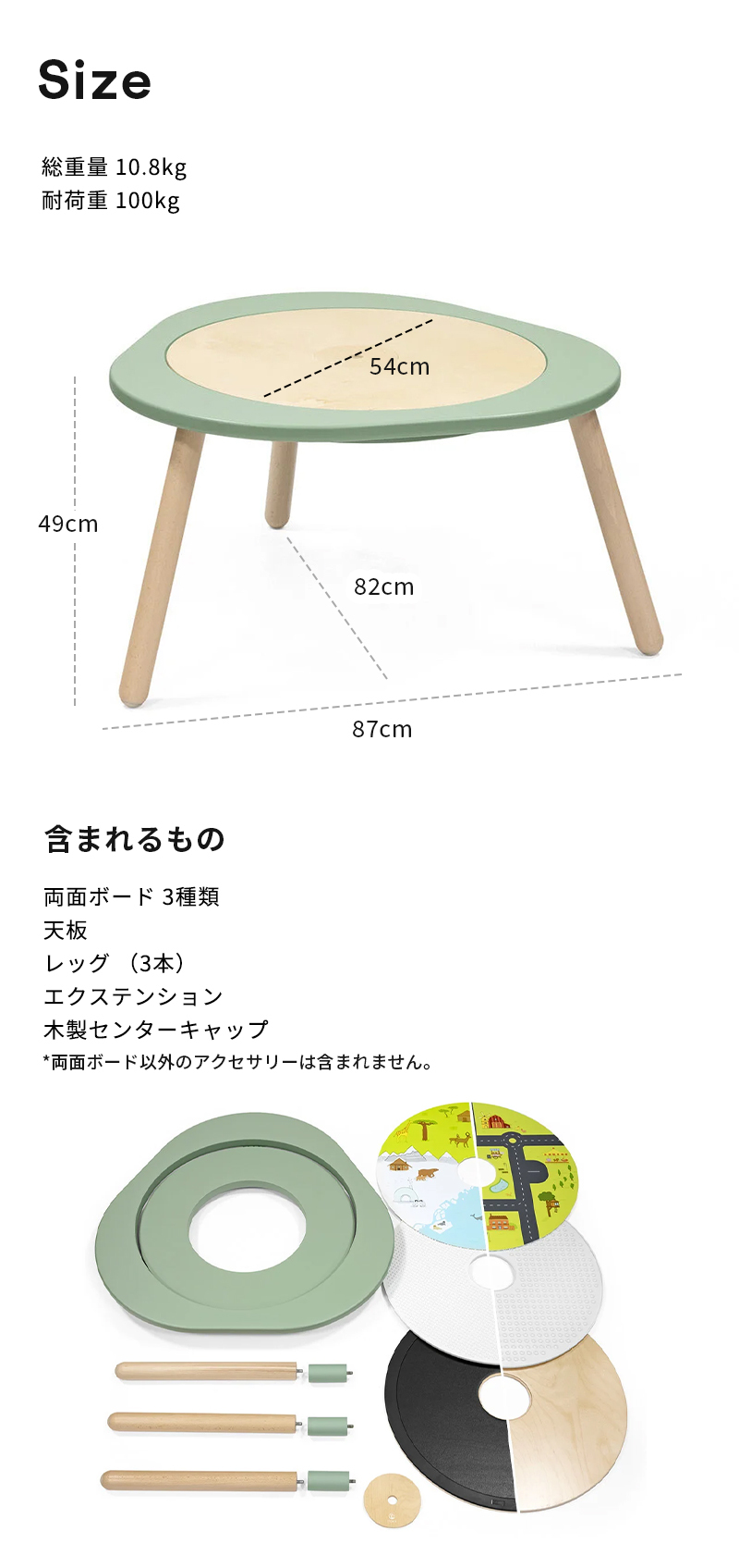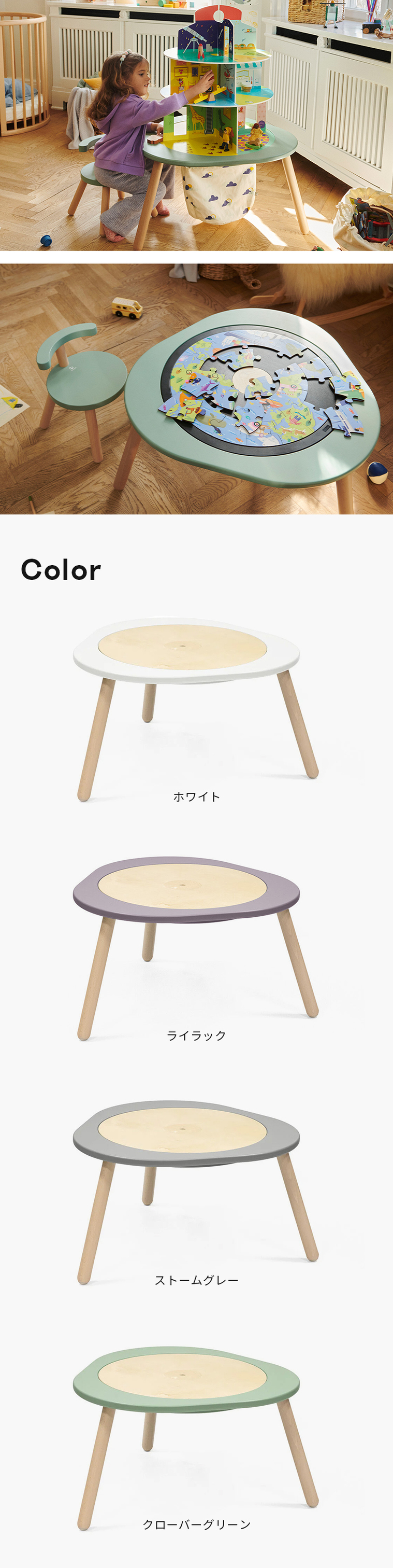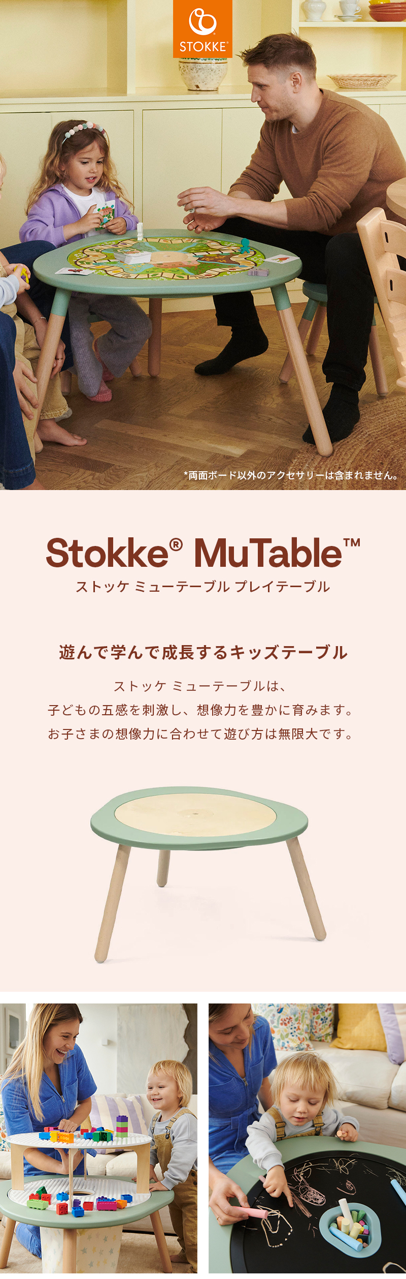 | 遊んで学んで成長するキッズテーブル! 子どもにとって、遊びは楽しいものであり、絶好の学びの機会でもあります。 ストッケ ミューテーブルは、子どもの五感を刺激し、想像力を豊かに育みます。 カラフルで手触りのよいプレイボードやアクティビティボードが、毎日の冒険の舞台です。ブロックやお絵かき、恐竜ごっこであっても、子どもたち自身が手と頭を使って未知の世界を探求することを「面白い!」と思う瞬間が遊びの中にはあふれています。 ストッケ ミューテーブル プレイテーブルは、耐久性が高く丈夫な木材を使用し、柔らかな丸みを帯びた曲線が特徴です。 小さなお子さまから、就学後のお子さままで、それぞれの発達段階に合わせた遊びを楽しむことができます。 テーブルには、長時間遊べる3つの両面ボードが付属し、楽しみながら集中力を高め、自立性や社会性を育むことができます。 高品質の天然木材を使用したプレイテーブルの脚部にはエクステンションが付属しているため、お子さまの成長に合わせて高さを調整することができ、長くお使いいただけます。 お子さまの成長に合わせて買い足せるアクセサリーで、いつも新しい発想で楽しめます。 ・創造的な遊びを通して楽しく学べるキッズテーブル ・認知、感情、社会性の発達に不可欠な遊びを通して、お子さまの学びをサポート ・生後18ヶ月頃から幼児、就学後のお子さまにも最適 ・お子さまの想像力に合わせて様々な遊び方が可能 ・微細運動の発達を促すカラフルで手触りの良いプレイボードとアクティビティボード ・自立性や社会性を育む遊びをきょうだいやお友達と長時間楽しめます ・繰り返し楽しめる両面アクティビティボード3枚付き:黒板&天板、タウン&ネイチャー、ブロック大&小 ・インテリア性の高いトレンドカラーから、お好きなお色をお選びいただけます ・丸みを帯びた丈夫な木製の脚で安全性に配慮 ・成長期のお子さまに高さ調節ができるよう、脚部エクステンションを付属 ・工具不要、約3分で簡単に組み立て ・発達段階に合わせた豊富なアクセサリー(別売)。工具不要で簡単に入れ替えて遊べます ・高品質の天然木材を使用 ・安全性試験済み ・有害物質不使用 ・3年長期保証 |