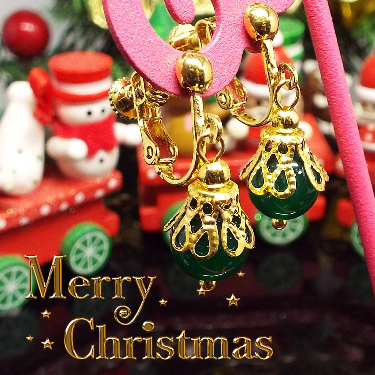 天然石 パワーストーン イヤリング グリーンメノウ Happy Xmas クリスマス きらきら 大人可愛い