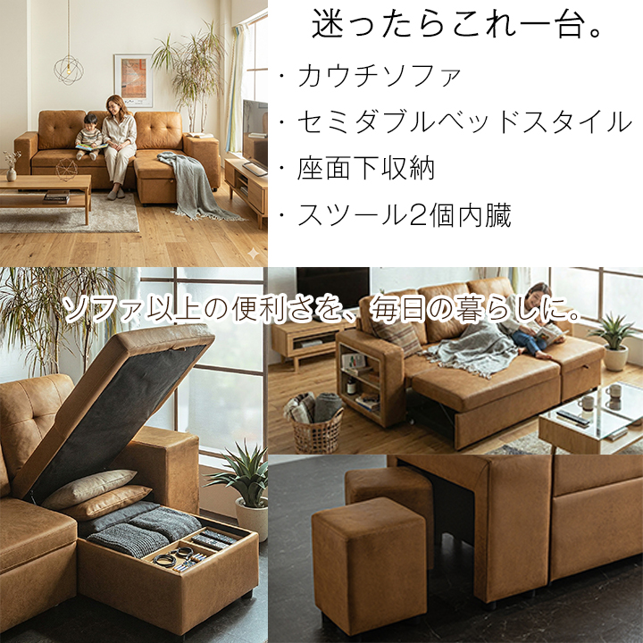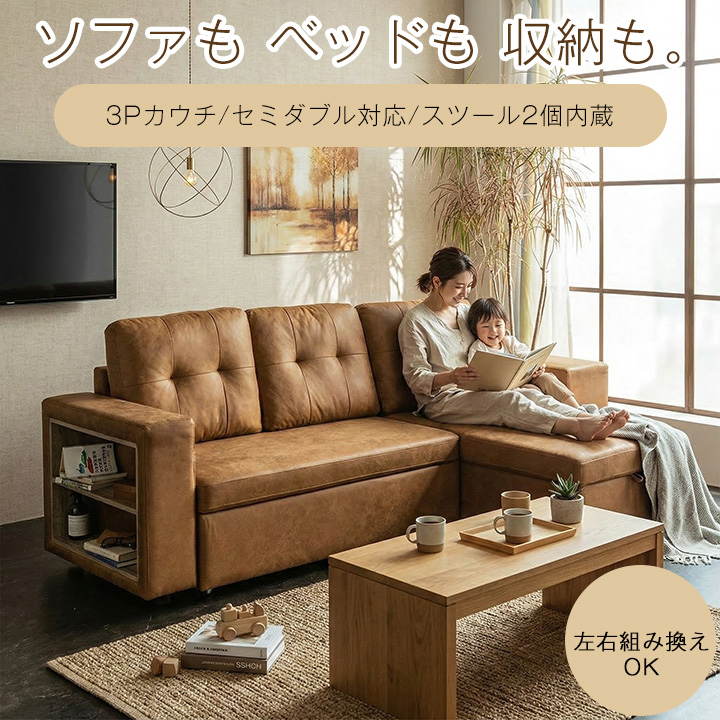 | 商品の特徴 | ■これ1台で、くつろぎも収納も完結 ソファ・カウチ・ベッドの3WAY仕様で、ライフスタイルに合わせて自由に使える多機能ソファ。 限られたスペースでも快適な空間を実現します。 ■ゆったり使える3人掛け+ベッド展開 普段は広々とした3人掛けソファとして、くつろぎ時間をサポート。 来客時やリラックスタイムには、セミダブルサイズのベッドとしても活躍します。 ■スツール2個内蔵&座面下収納 スツールは本体にすっきり収納可能。 さらに座面下にも収納スペースを備え、ブランケットや小物類をまとめて収納でき、お部屋をすっきり保てます。 ■高級感のあるファブリックレザー レザーのような質感とファブリックのやさしい肌触りを両立。 見た目の高級感と使い心地を兼ね備えた張地です。 ■一人暮らし・ワンルームにも最適 ソファ・ベッド・収納を1台に集約することで、省スペースでも機能的な暮らしを実現。 限られた空間を有効活用したい方におすすめです。 |