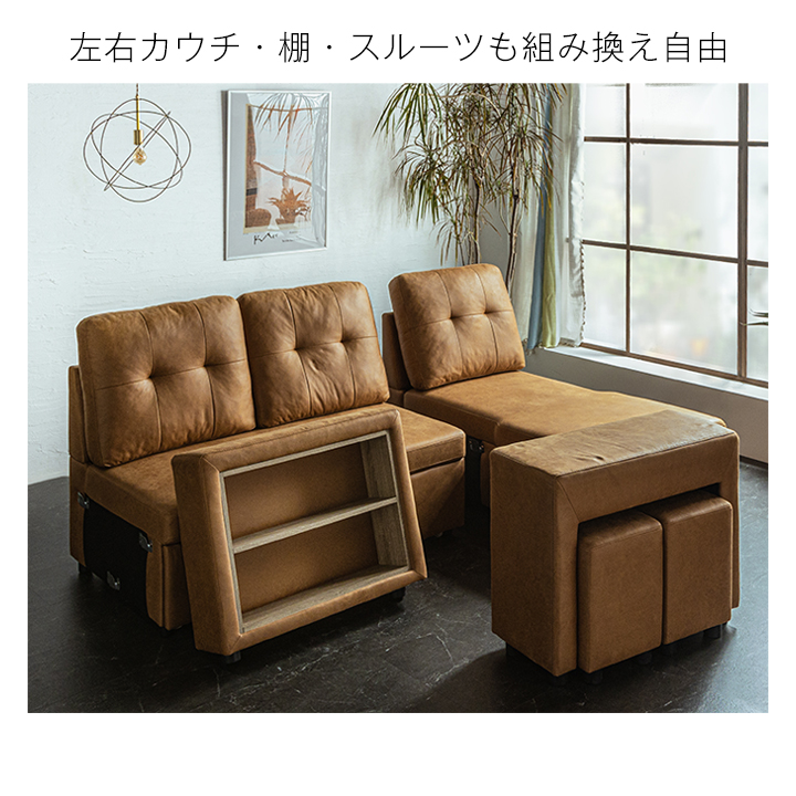 | 機能・仕様 | ソファ・ベッド切り替え カウチ座面下収納 アーム部にスツール内蔵(2個) カウチ・アームの左右付け替え可能 |