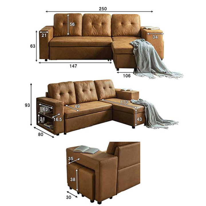| サイズ | 総寸法 幅253x奥行143x高さ93cm (座面高43cm、座面奥行49cm、カウチ奥行113cm) (ベッド時寸法 幅113x長さ198cm) ◆内蔵スツール 幅35x奥行30x高さ38cm(2個) |