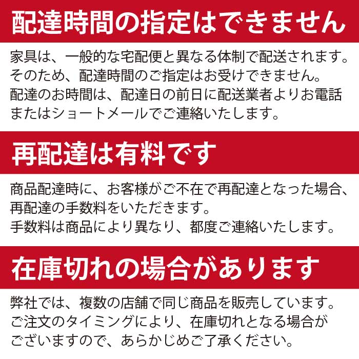 | 商品画像について | 商品ページの画像は、撮影時の照明の影響や、お客様がご覧のデバイス・モニターにより、実際とは色味や見え方が多少異なる場合がございます。 また、お客様の家具設置場所の環境によっても、同様に画像と色味や見え方が異なる場合がございます。 あらかじめご了承のほどお願いいたします。 「画像と色味や見え方が異なる」という理由による返品は、お受け出来かねます。 |