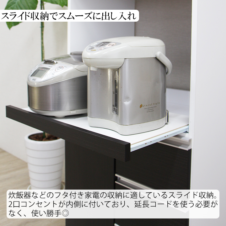 | 機能・仕様 | 引き出し:レール無し(全段) スライド棚:レール有り オープン部:コンセント付き(2口・ブレーカー付き・コード長170cm) |