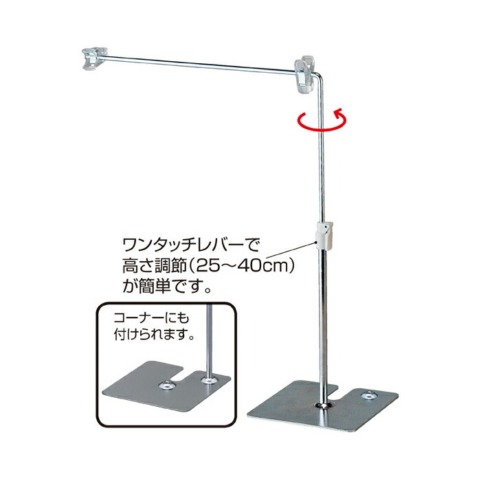 ポップを両面から見せることができます。ワンタッチレバーで高さ調節(25〜40cm)が簡単です。