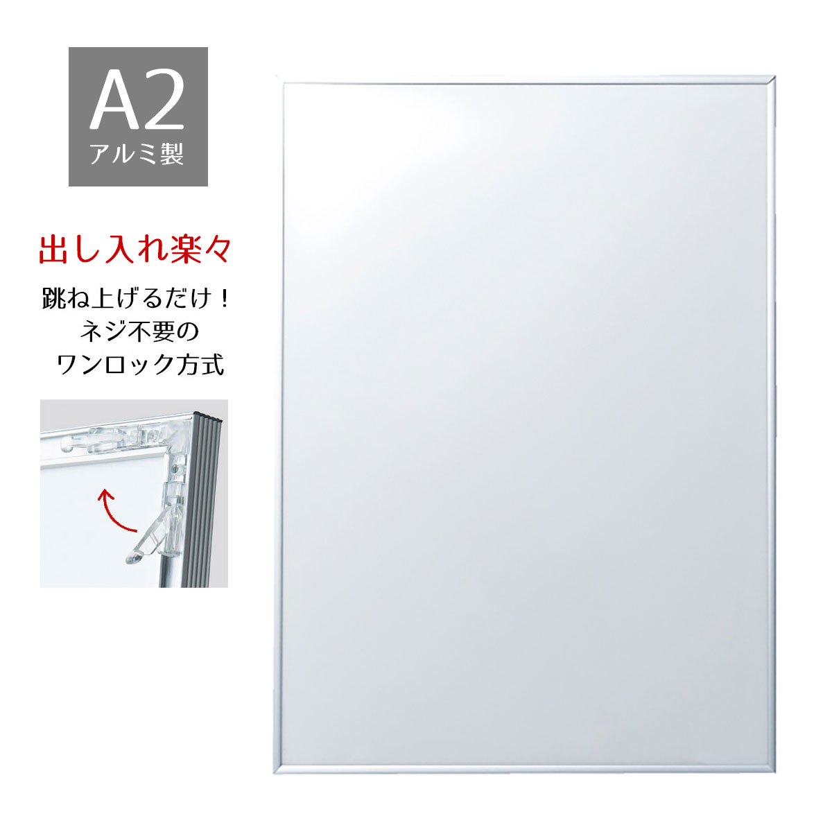 ポスターの出し入れが簡単な利便性を重視した、ネジ不要のワンロック方式。吊下げ金具の位置を自由に変更可能です。