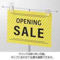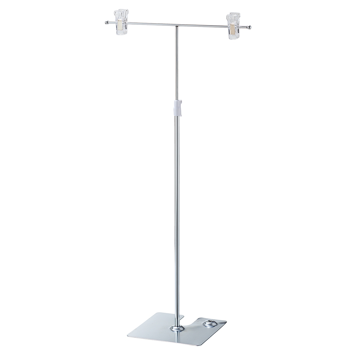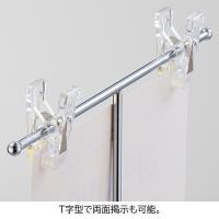 両面にポップを掲示できるT型の卓上スタンド。ワンタッチレバーで高さ調整可能。クリップは取り外し可能で、ポップに合わせて位置を調整できます。支柱の位置はセンター・コーナーで付け替え可能です。