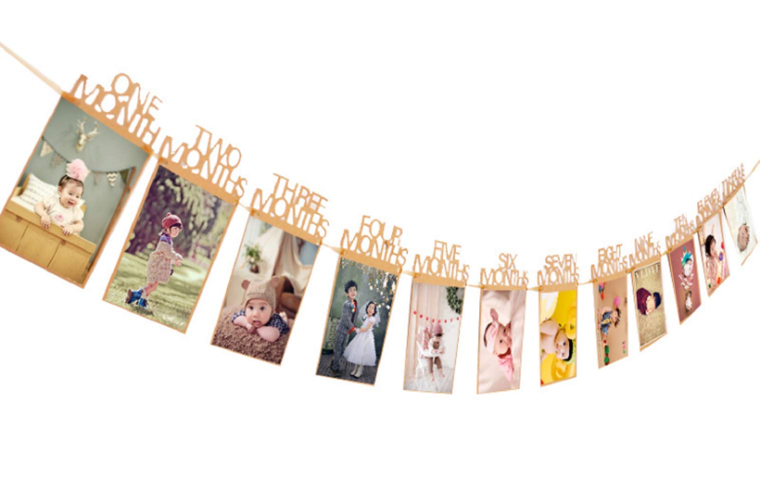 - クラフト紙のシンプルカラーの 月齢ガーランド。英字で1-12ヶ月(計12枚)付属の写真を貼ってオリジナルの記念ガーランドにもなります。