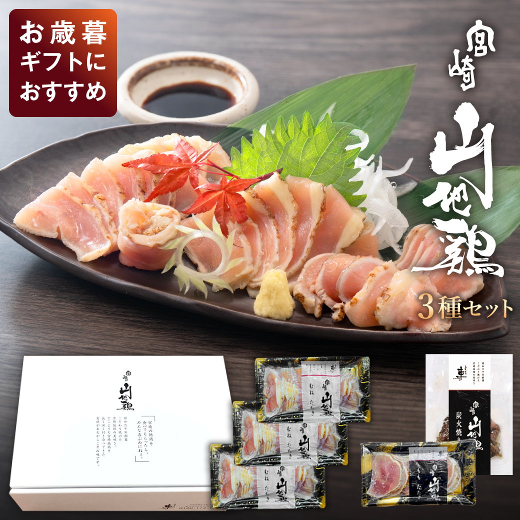 | 内容量 | 1.宮崎山地鶏 炭火焼き レア焼き 100g×1袋 2.宮崎山地鶏 ももたたき 100g×1袋 3.宮崎山地鶏 むねたたき 150g×3袋 |
