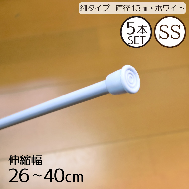 つっぱり棒 5本セット 伸縮幅 約26〜40cm 細タイプSS ホワイト つっぱりポール 直径13mm 目隠し 棚 小窓 突っ張り棒