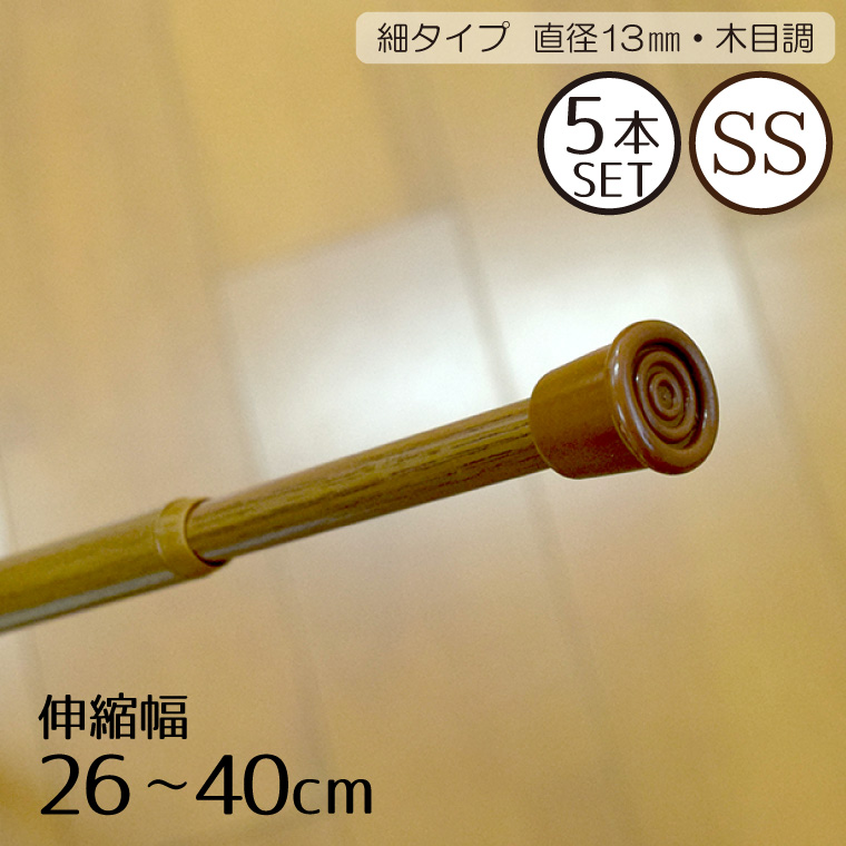 つっぱり棒 5本セット 伸縮幅 約26〜40cm 細タイプSS 木目 ブラウン つっぱりポール 直径13mm 棚 在宅 ワーク 勤務 目隠し 棚 小窓