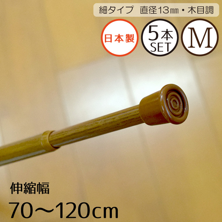 つっぱり棒 5本セット 細タイプM 木目調 つっぱりポール 伸縮幅 約70〜120cm 直径13mm ブラウン 収納 棚 目隠し 突っ張り棒