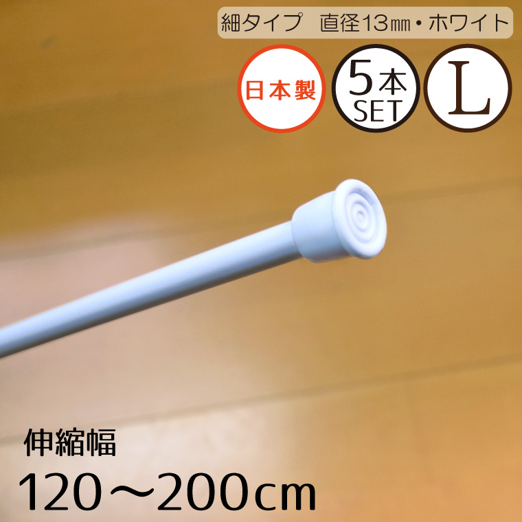 つっぱり棒 5本セット 伸縮幅 約120〜200cm 細タイプL ホワイト つっぱりポール 直径13mm 棚 在宅 ワーク 勤務 目隠し 棚 小窓