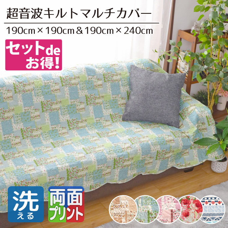 マルチカバー 正方形 長方形 2枚セット 洗える 北欧 約190×190cm 約190×240cm こたつ布団 ソファ ベッド カバー パッチワーク柄 超音波キルト フロリア