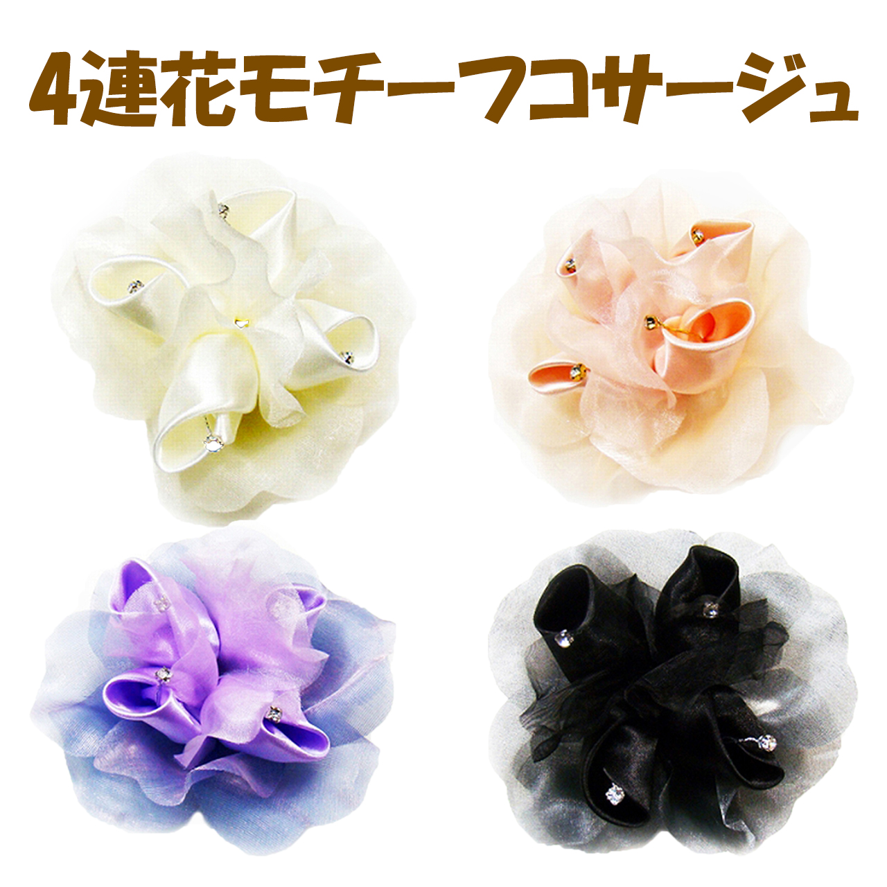 コサージュ 結婚式 卒業式 入学式 母親 親族 おしゃれフォーマル 50代 40代 80代 花 安い アクセサリー 髪飾り サテン生地 4連花