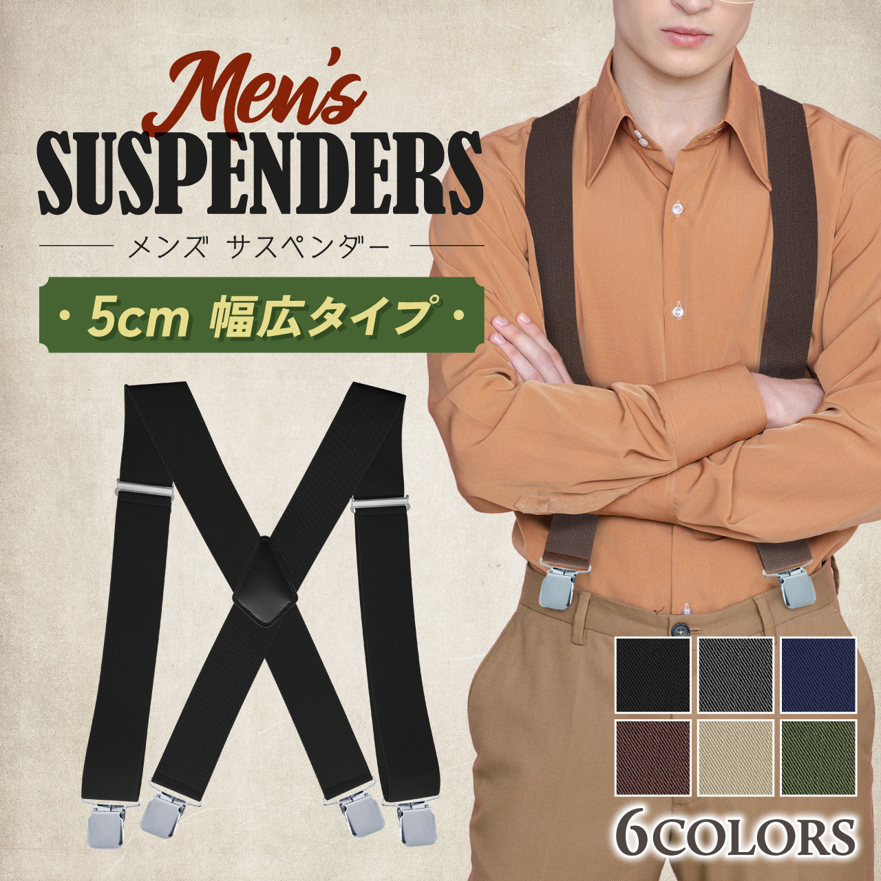 このサスペンダーは、メンズ向けのX型デザインで、幅広50mmのしっかりとした作りが特徴です。