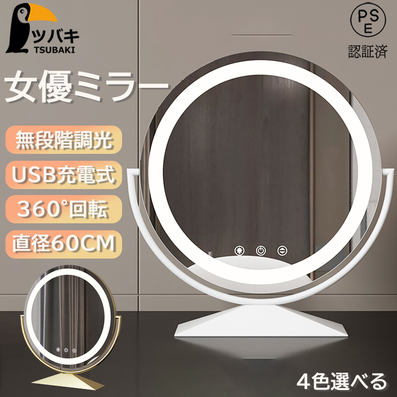 女優ミラー 卓上ミラー ライト付き 大きい 円形 60cm 無段階調光 充電式 360°回転 ライト付きミラー 化粧鏡 おしゃれ led ライト付き メイク アップ ledミラー