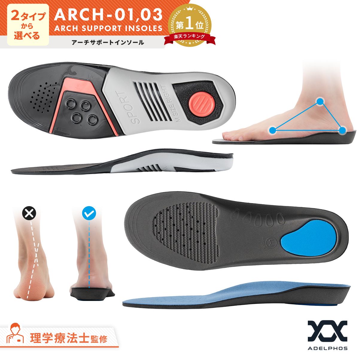 【2点以上で20%OFFクーポン有】【現役理学療法士監修】 インソール 衝撃吸収 2タイプ アーチサポート 扁平足 土踏まず 中敷き ランニング メンズ レディース