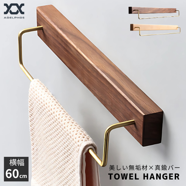 タオルハンガー 洗面所 真鍮 無垢材 横幅60cm タオル掛け トイレ キッチン 木製 壁 壁付け タオルホルダー おしゃれ タオルかけ クルミ ブナ TH5