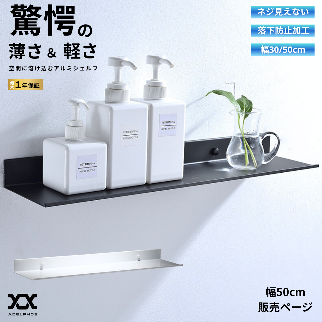 ウォールシェルフ 壁掛け 横幅50cm 棚 ウォールラック アルミ 石膏ボード 飾り棚 壁面収納 トイレ 洗面所 キッチン スパイスラック 薄型 軽量 カフェ風 WS1