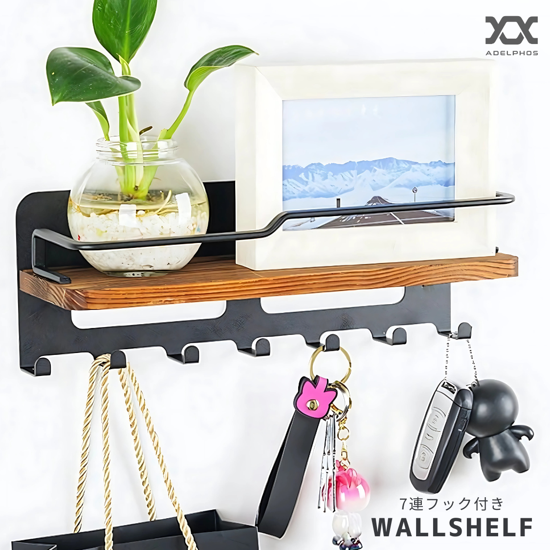ウォールシェルフ おしゃれ ウォールフック 7連 ウォールハンガー アイアン 木製 スチール 壁 棚 壁掛け棚 飾り棚 ネジ固定 WS3