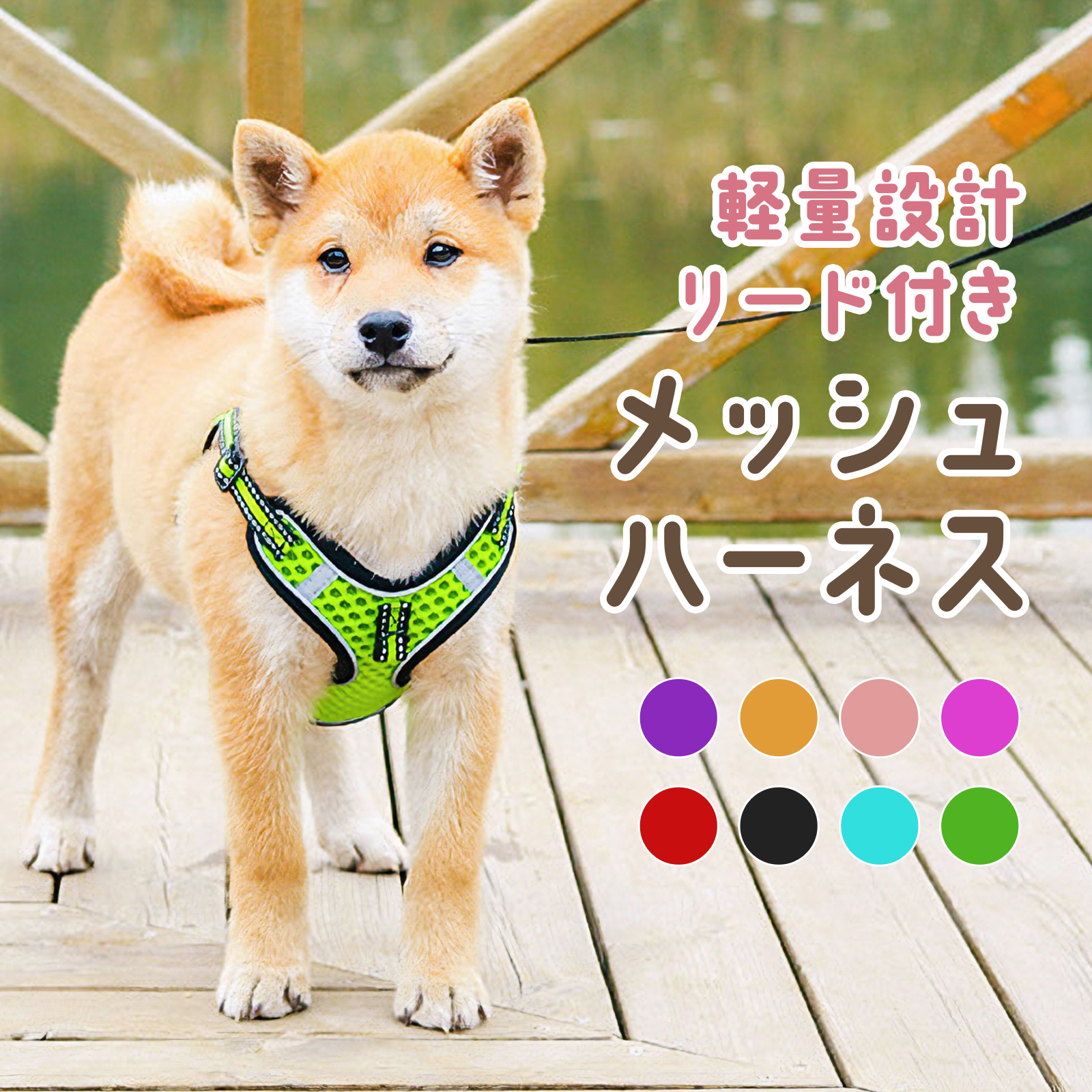 メッシュ素材で軽量かつ通気性に優れたハーネス。ペットの快適な散歩をサポート。
