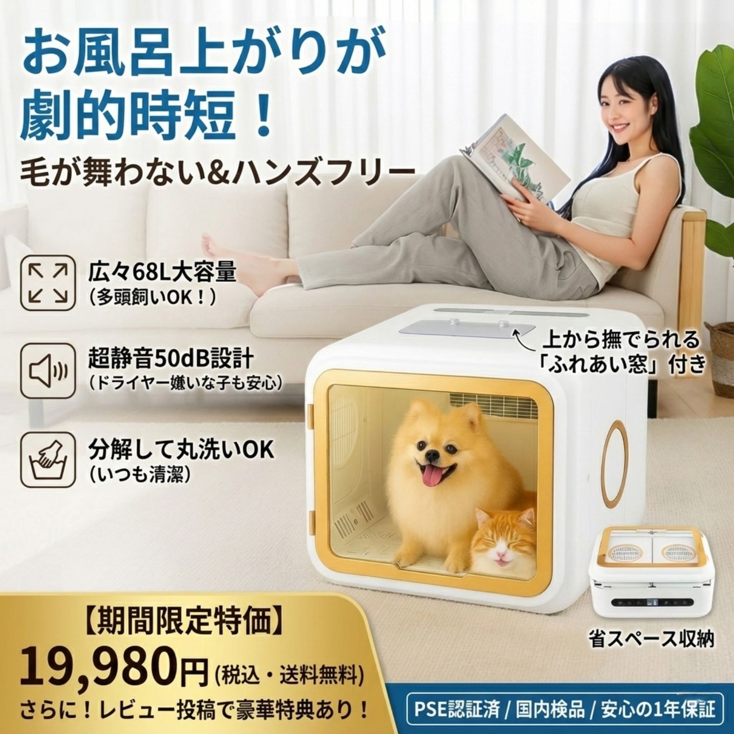 ペットドライヤー ペットドライルーム 2025年最新モデル 1年保証付 大型猫対応 68L 大容量 静音 折りたたみ 分解式 ドライヤーハウス ペット乾燥ボックス 小型犬