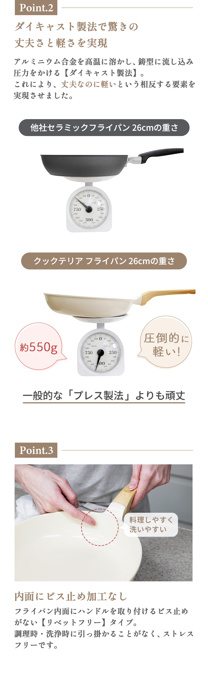26cmサイズで約550gの軽量化を実現(一般的なプレス製IHフライパン2.9mm底厚品は約780g程度)