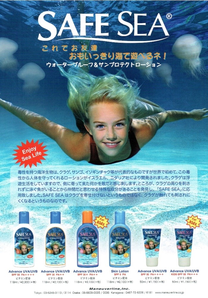 ところがクラゲの周りのプランクトンを食べて刺されずに共存共栄する魚がいることから、クラゲに仲間だと思わせる特殊な成分があることを発見し【SAFE SEA(セーフシー)】に応用しました。