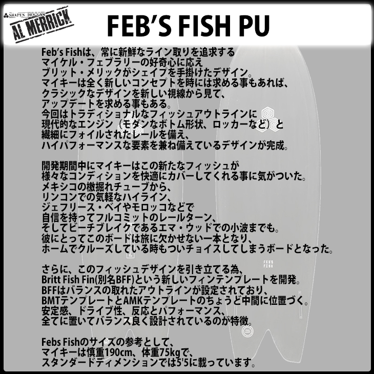 Feb’s Fishは、常に新鮮なライン取りを追求するマイケル・フェブラリーの好奇心に応えブリット・メリックがシェイプを手掛けたデザイン。