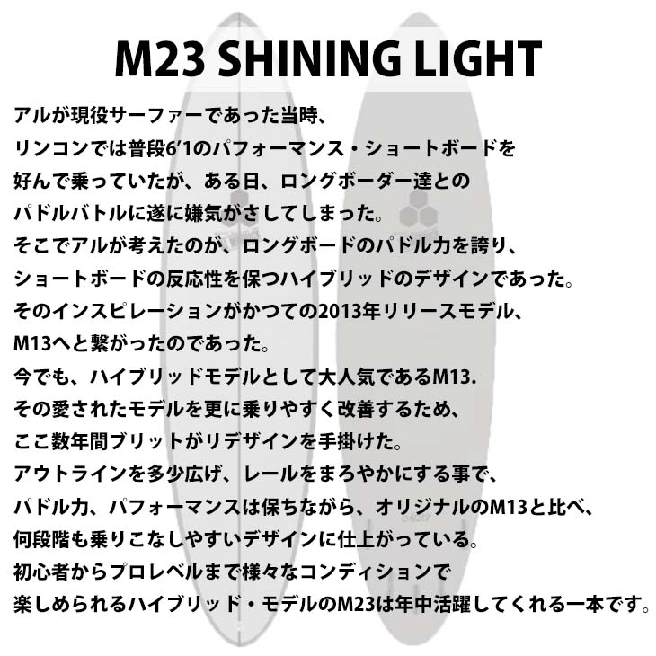 アウトラインを多少広げ、レールをまろやかにする事で、パドル力、パフォーマンスは保ちながら、オリジナルのM13と比べ、何段階も乗りこなしやすいデザインに仕上がっている。