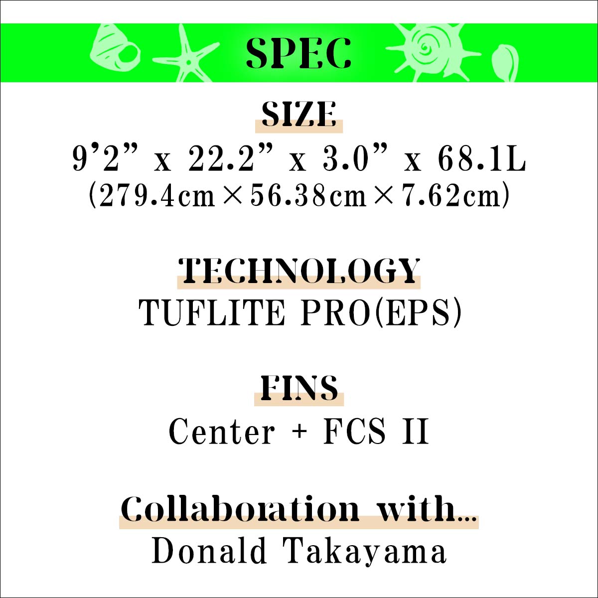 【SPEC】サイズ:9'2” x 22.2” x 3.0” x 68.1L(279.4cm×56.38cm×7.62cm)