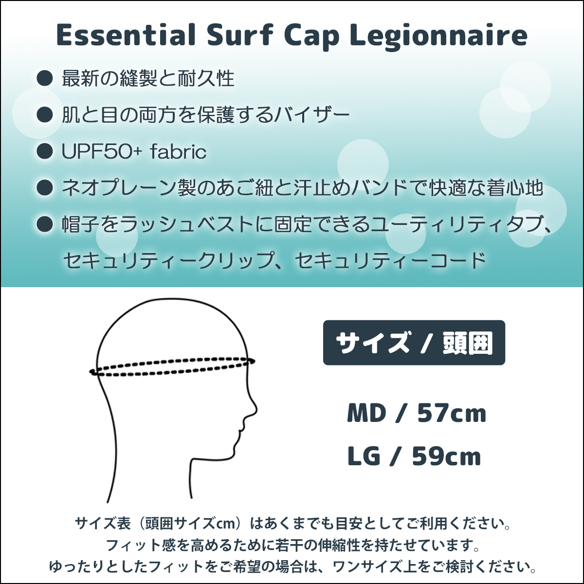 軽量で速乾性に優れたこのサーフキャップは、太陽光線から保護し、UPF50+で、水から砂浜への移動に最適。