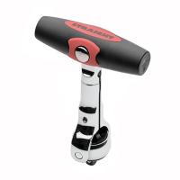 ヘッド部分が180°自由に回転するスイベル仕様で、ヘッド部とハンドルを一直線上にすることで、ドライバーの様に早回しができるラチェットレンチです。グリップ部をT字状にして握り込んで回すこともできます。