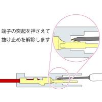 ターミナルリリースツール 0.8mmは、配線のカプラーからターミナル(端子)を引き抜く際に使用します。端子の突起を押さえて抜け止めを解除し、端子を抜き取ります。