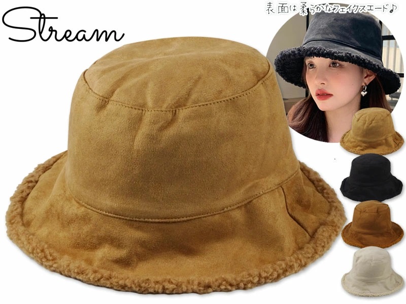 表面は柔らかなフェイクスエード、裏地をボアで切替た注目のムートンライクなバケットハット。柔らかな雰囲気がカワイイ♪ブリムの先にワイヤー入りで自分好みにアレンジ!!。