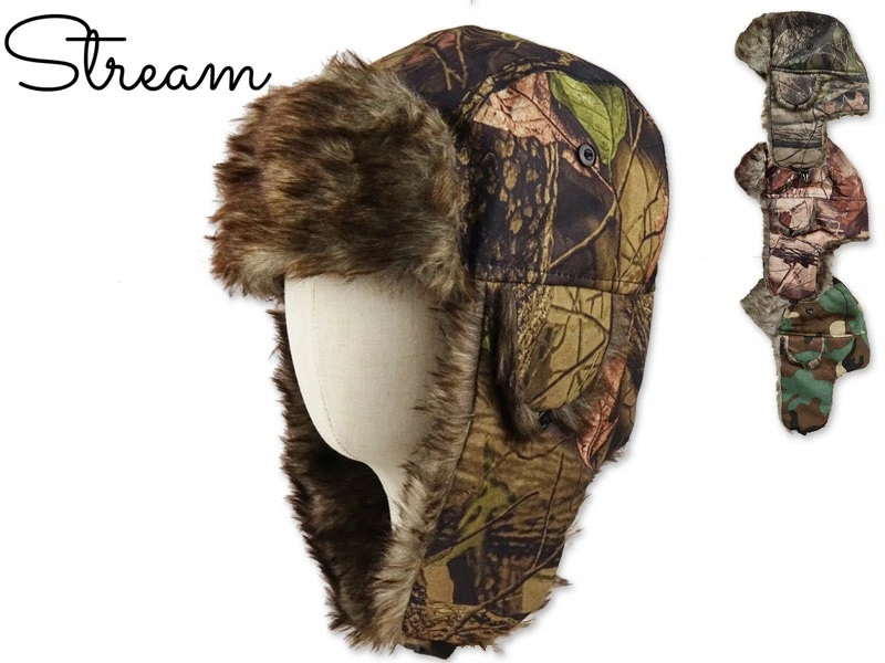 ポリエステル生地を使用、ライナーはキルティングライナー。カモ柄の軽量フライトキャップ。耳宛て部分は先端のクリップで上部に固定する事が可能です。
