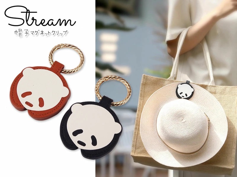 ハットクリップをバックに付けて、ツバやバイザー部分を磁石の間に挟み込むだけ。フェイクレザーを使用、カバンの持ち手等につけてバックチャームとして付けておく事も出来る優れもの。
