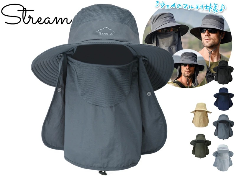 360度しっかりガードの日除けハット。口元部分はメッシュ加工を施しているので、風通し良くて息苦しさを感じない構造。3wayなので、帽子だけを被って普段のお出かけやちょっとしたハイキングに。ネックカバーをつけて登山やキャンプに。フェイスカバーをつけて釣りや日差しがきついアクティビティに…と、これ1つでマルチに使える優れもの。農作業やガーデニング、ワンコの散歩にも最適です。
