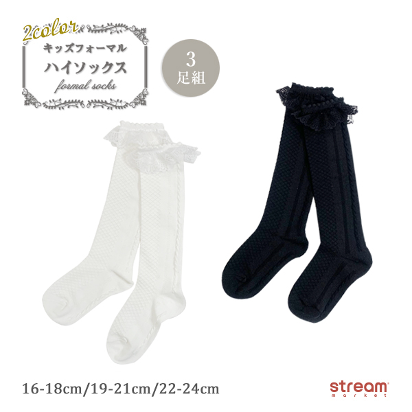 靴下 キッズ ハイソックス 白 女の子 入園 入学 卒業 卒園 結婚 式 レース フリル フォーマル セレモニー 黒 幼稚園 保育園 小学生 小学校 ジュニア 可愛い 発表会 七五三 子供 綿混 子ども用 くつ下 ピアノ発表会 3足セットまとめ買い 16 17 18 19 20 21 22 23 24 cm ホワイト ブラック 女子 入園入学準備 白靴下