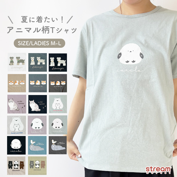 Tシャツ レディース シュナウザー 秋田犬 ネコ シロクマ シマエナガ アザラシ パンダ アニマル柄 ルームウェア 半袖 プリントT M-L 夏 トップス