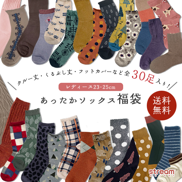 送料無料 福袋 2026 靴下 レディース 冬 おまかせ 30足セット まとめ買い おまかせ おしゃれ あったか 暖かい ソックス クルー くるぶし フットカバー 秋冬 北欧 発熱 アニマル 無地 五本指 綿 ウール かわいい 婦人 女性 ちょっとした プレゼント 23 24 25 cm 秋物 冬物 stream ストリームマーケット