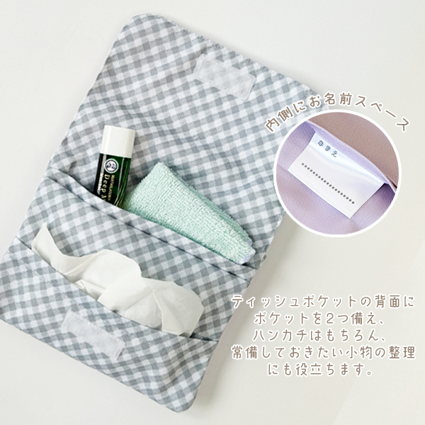 スカートやズボンに簡単に装着でき、通園・通学時のハンカチ・ティッシュの持ち歩きに便利です。
