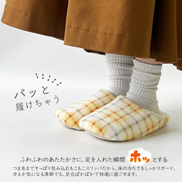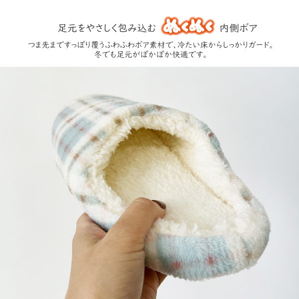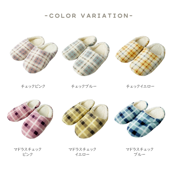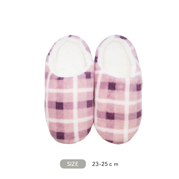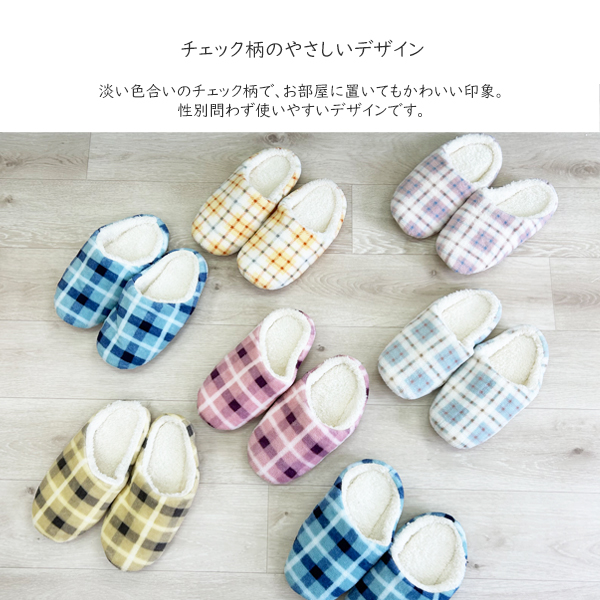 淡いチェック柄がかわいい、もこもこボアの冬用スリッパ。