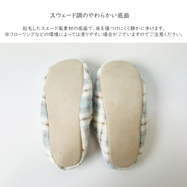 底面はスエード調のやわらかい素材で、歩く音が静かでお部屋にやさしい仕様。