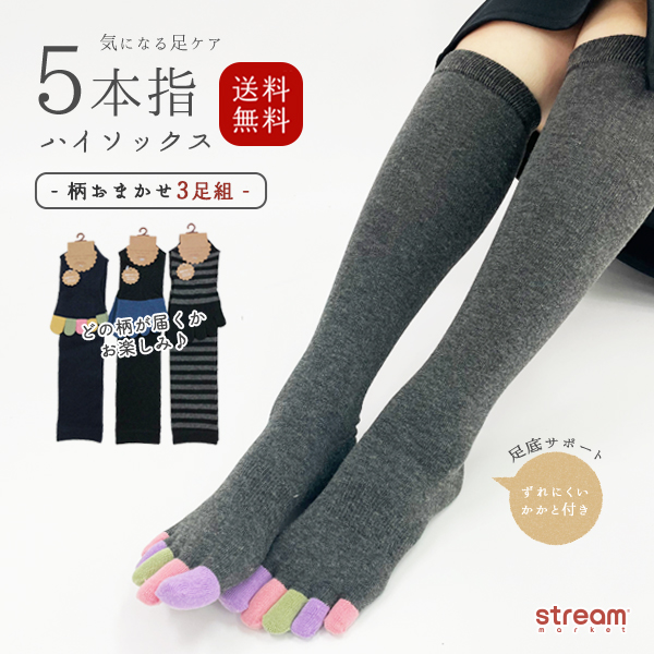 靴下 5本指 レディース ハイソックス セット 3足 おまかせ 暖かい 冬 五本指靴下 おしゃれ 可愛い 無地 ボーダー アーガイル 23-25cm ゆうパケット送料無料
