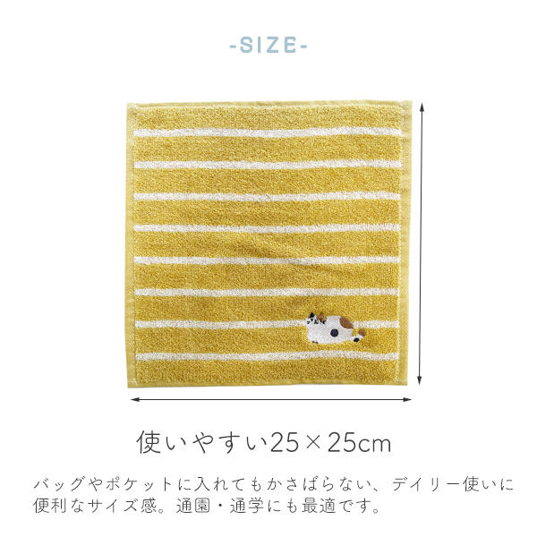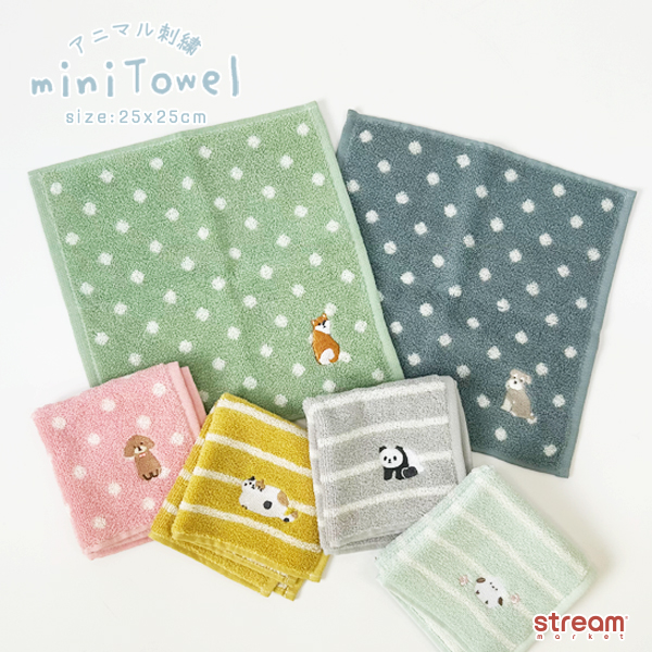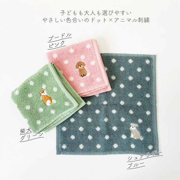 ミニタオル ハンドタオル 刺繍 タオル 25×25cm ドット柄 かわいい シュナウザー ネコ シマエナガ パンダ 柴犬 プードル ギフト ゆうパケット6点まで可