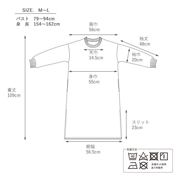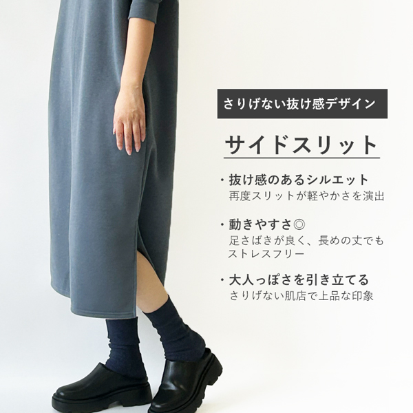 ・ゆったりシルエットで体型カバー、サイドスリットで動きやすさも◎。