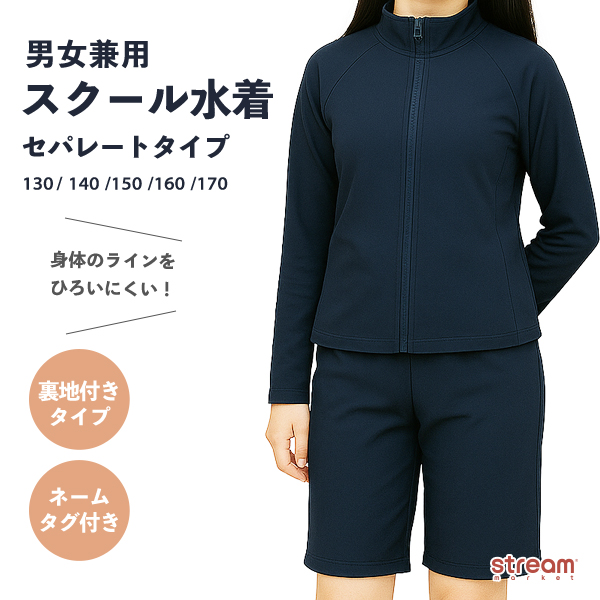 スクール水着 女の子 男の子 セパレート ラッシュガード キッズ セット ファスナー 長袖 170 160 150 140 130 小学校 小学生 スクール 紺 ネイビー 水着 スイムウェア 上下セット 裏地 男子 女子 中学生 子ども用 海水浴 川遊び プール ユニセックス