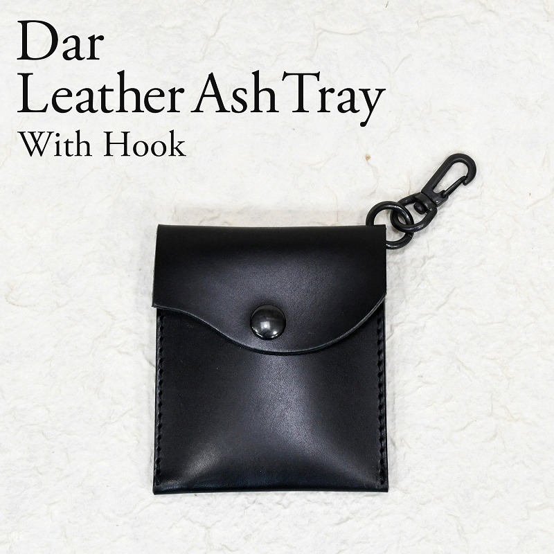 兵庫県産のブラックヌメ革と艶消し黒メッキを施した金属パーツを使用した大人な雰囲気のフック付き革携帯灰皿。
