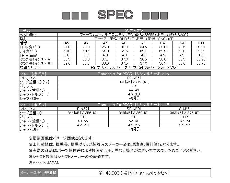 プロギア 2025 PRGR 03 IRON [ゼロサン] アイアン(Diamana M for PRGR オリジナルカーボン)5本セット